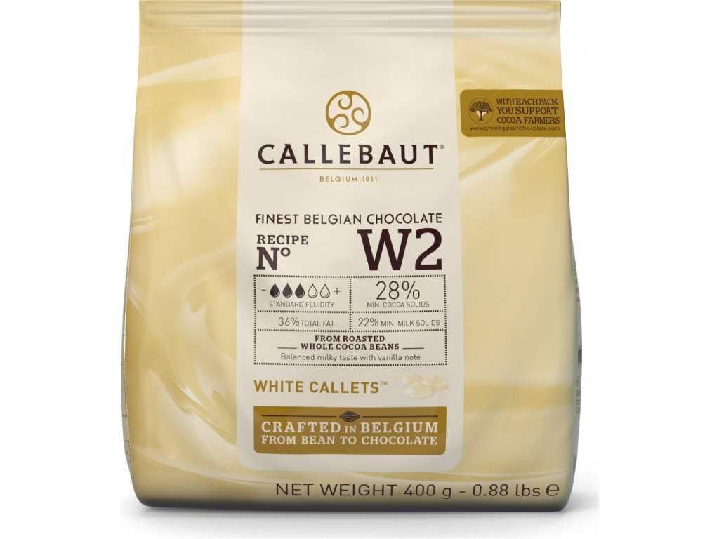 Skvěle vyvážená smetanově mléčná chuť.Nejjemnější bílá belgická čokoláda.Univerzální použití čokolády. Čokoláda je ve formě malých bílých čokoládových pecek (CalletsTM). Čokoláda se velmi dobře rozpouští a je vhodná na výrobu pralinek. Obsah kakaových součástí: 28 % Obsah mléčné sušiny: 23 % Složení: cukr, kakaové máslo, sušené plnotučné MLÉKO, emulgátor: E322- SÓJOVÝ lecithin, přírodní vanilkové aroma.Doplňkové parametry
