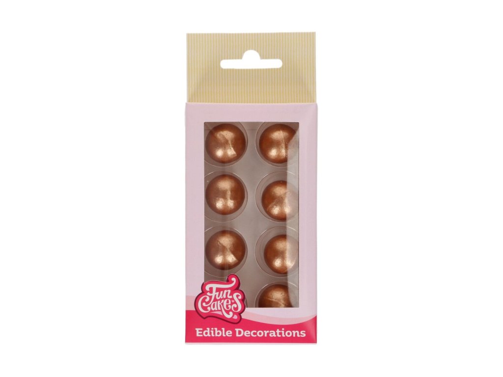 Dodejte svým slavnostním pochoutkám trochu bronzového zlata s těmito bronzovými čokoládovými kuličkami od FunCakes! Čokoládové kuličky bronzově zlaté mají krásný vzhled a velmi zjednoduší zdobení dortů, dezertů a cupcaků. Složení: cukr, kakaové máslo, sušené mléko (plnotuté), emulgátor: E322 (slunečnice), barvivo: E172, aroma (vanilka). Alergeny jsou ve složení vyznačeny tučně. Může obsahovat stopy: sóji. Tento produkt je: certifikován jako bezlepkový (NL-090-204), vhodný pro vegetariány. Skladujte na chladném a suchém místě (12-20°C), bez slunečního záření a cizího zápachu. Velikost: asi 2 cm v průměru. Obsah: 8 kusů.Doplňkové parametry